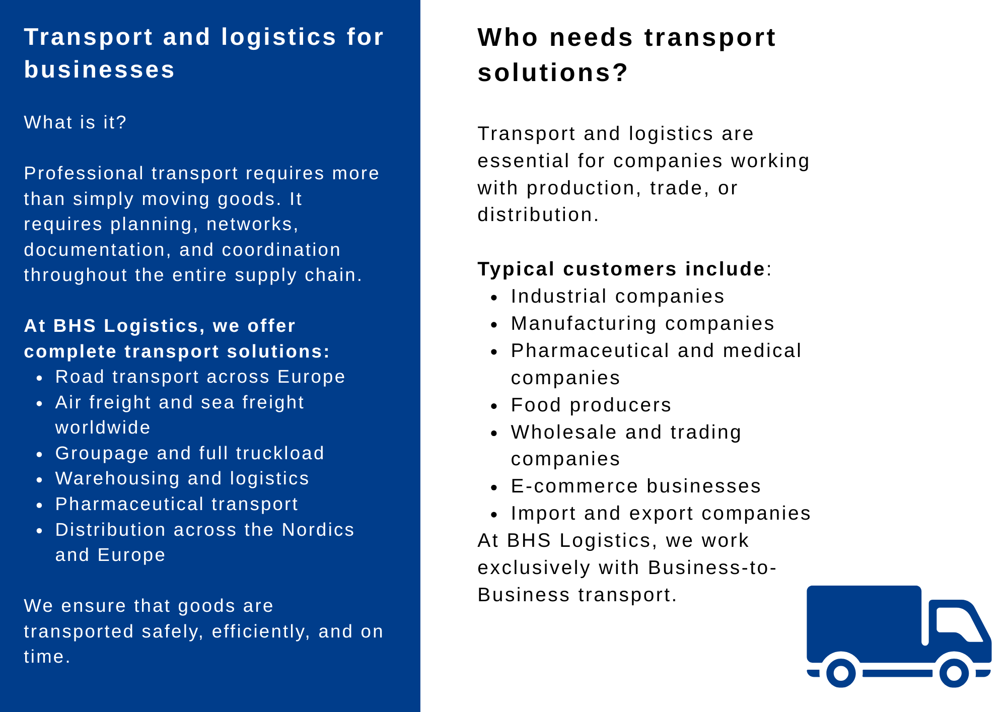 At BHS Logistics, we work exclusively with Business-to-Business transport (B2B).